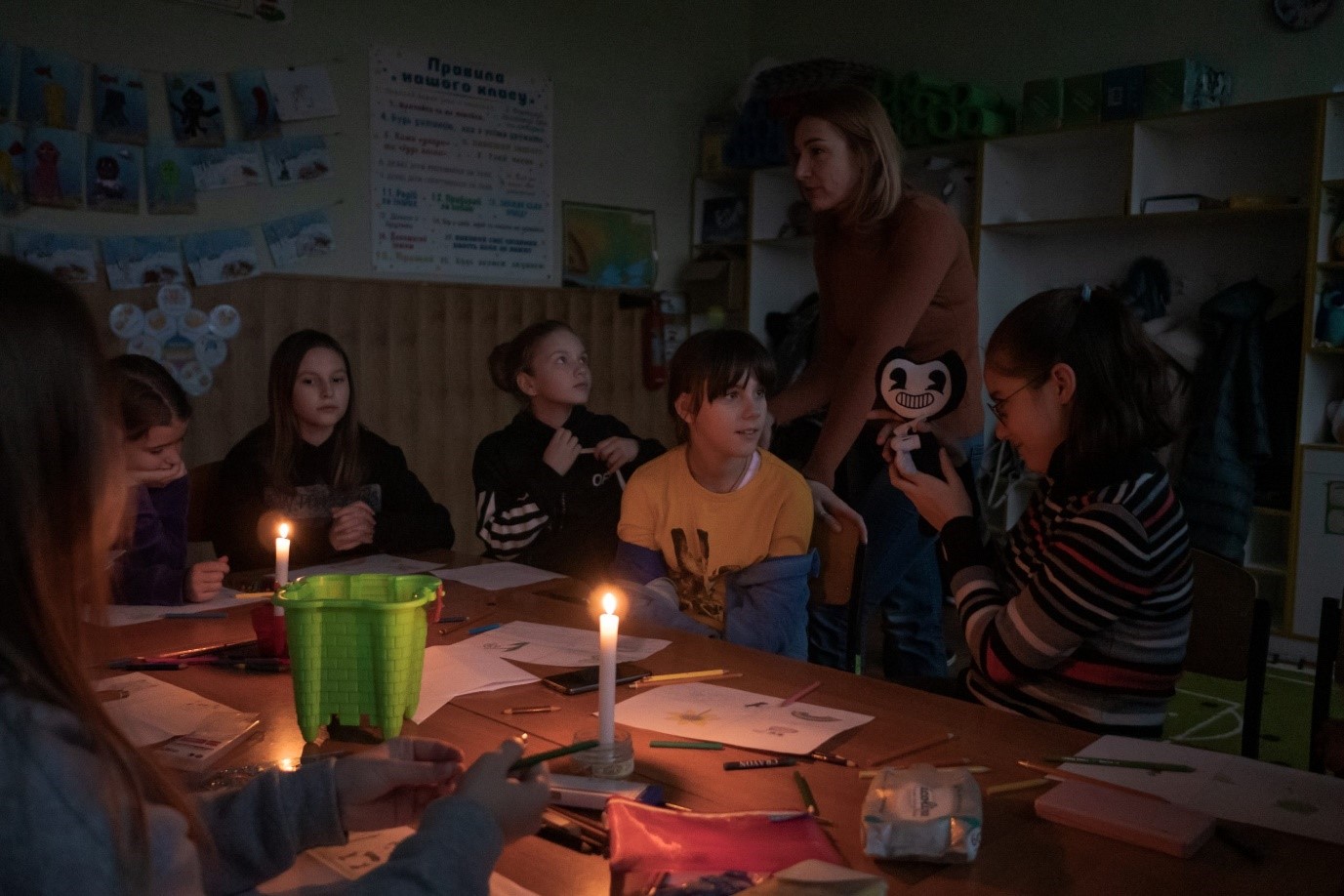 „Nazywam się Kateryna, mam 12 lat i uczęszczam do szóstej klasy. Podczas przerw w dostawie prądu w szkole lekcje są często przerywane, skracane lub przenoszone do innych klas. Te zmiany utrudniają mi skupienie się na nauce i zapamiętaniu tego, co mówi nauczyciel. Zimą jest ciemno nawet w ciągu dnia i bardzo trudno jest czytać z tablicy lub podręczników. Kiedy wyłączają światło, denerwuję się i stresuję, zwłaszcza podczas przygotowań do sprawdzianów. W domu sytuacja nie jest lepsza, ponieważ często uczę się wieczorem bez niezawodnego oświetlenia i dostępu do Internetu, więc nie zawsze mogę przygotować się do lekcji tak, jak trzeba. Zaczęłam bardziej martwić się o swoje oceny, a tak bardzo chciałabym po prostu spokojnie żyć i uczyć się.”